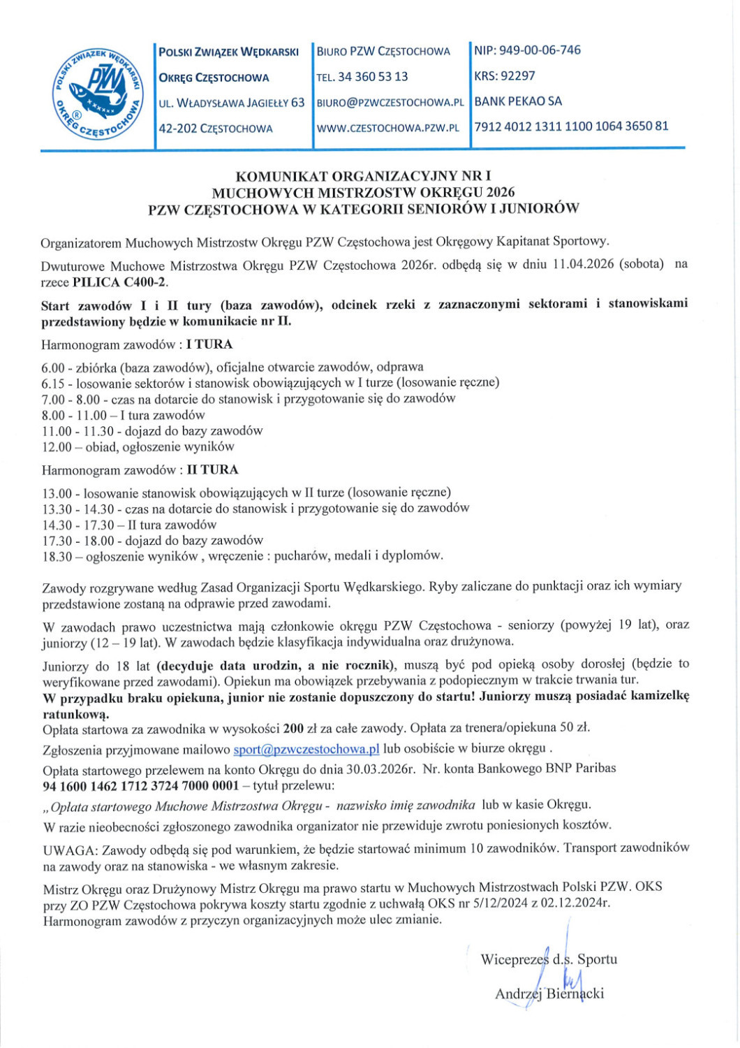 XXXIII Zawody Spławikowe o Puchar Prezesa Okręgu - 12 kwietnia 2026 r.