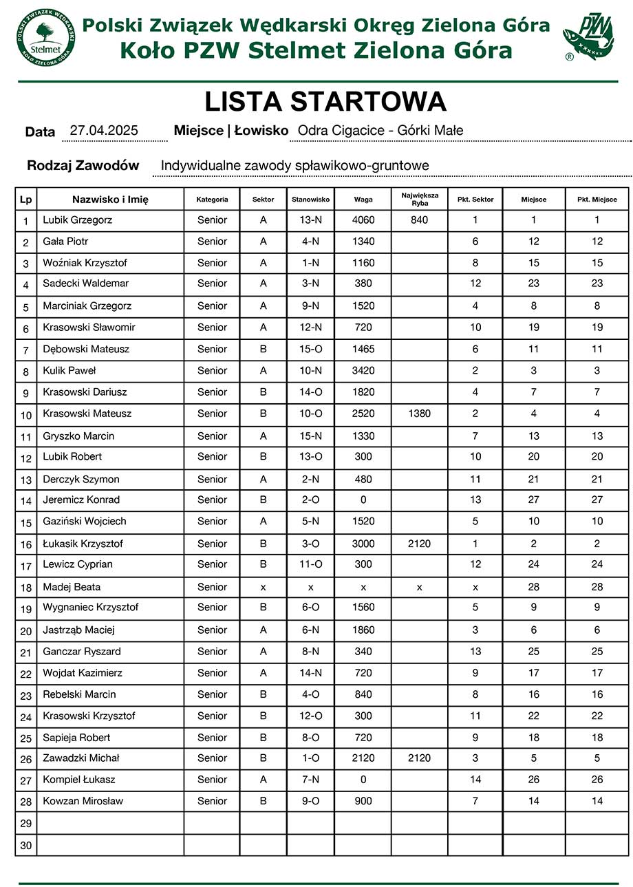 Spławikowe zawody „WIOSNA” 2026 r.